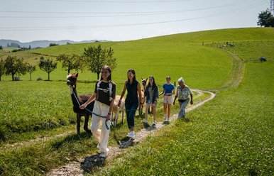 Erlebe die sanften Lamas hautnah und geniesse unvergessliche Moment inmitten idyllischer Natur. Unsere tierischen Begleiter schenken Ruhe, Freude und ein besonders Wandererlebnis.