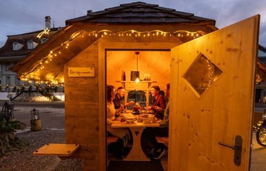 In Wangen an der Aare steht in den Wintermonaten ein urchiges Chalet. Darin werden Ihnen würzige Käsefondue-Variationen und leckere Beilagen serviert.