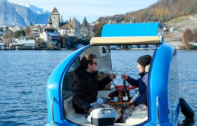 Erleben Sie eine gemütliche Bootsfahrt auf dem Thunersee. Während Sie ein heisses Fondue geniessen, sind Sie selber der Kapitän vom schwimmenden Wohnwagen Sealander.